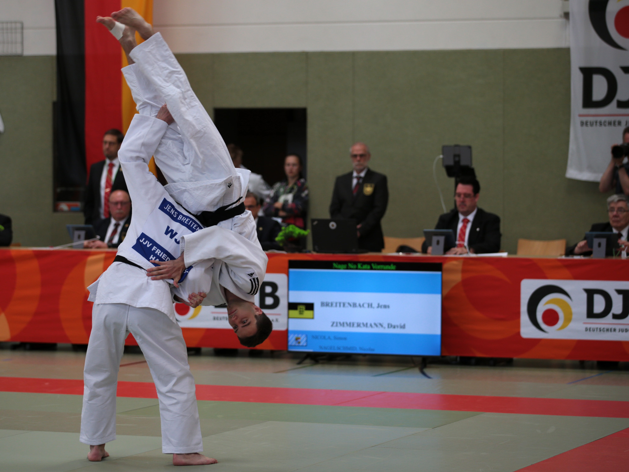 In der Nage-no-Kata debütierten zwei württembergische Paare. Jens Breitenbach und David Zimmermann vom JJJV Friedrichshafen durften am Samstag die Meisterschaften als erstes Paar auf der Matte eröffnen. Natürlich war die Anspannung groß, trotzdem brachten sie eine solide Kata auf die Matte. Was das bedeutete, zeigte sich schon bald. Das anschließend startende bayrische Paar erreichte weniger Punkte, die Vizemeister des Vorjahres patzten. So schoben sie sich immer weiter nach oben. Am Ende lagen die Friedrichshafener gerade einmal einen halben Punkt hinter den Teams auf Platz 5 und 6, die zum Finaleinzug berechtigen. Auch Sandro Nasti und Marquard Michael vom TV Hochdorf zeigten eine ordentliche Premierenkata und reihten sich knapp hinter den Bodensee-Judoka auf dem achten Platz ein.