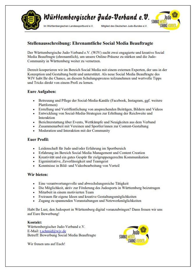 Der Württembergische Judo-Verband e.V. (WJV) sucht eine engagierte und motivierte Persönlichkeit für die Position des Jugendsprechers sowie zwei kreative Social Media Beauftragte zur Stärkung unserer Online-Präsenz.