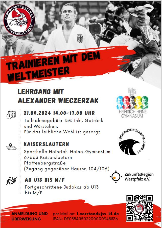 Der JSV Kaiserslautern richtet in Kooperation mit dem Judo-Team des Heinrich-Heine-Sportgymnasiums am 21.09.2024 von 14.00 bis 17.00 Uhr einen Lehrgang mit dem Judoprofi und Weltmeister Alexander Wieczerzak aus. Alle interessierten Judokas, Vereine und Verbände sind herzlich eingeladen.
