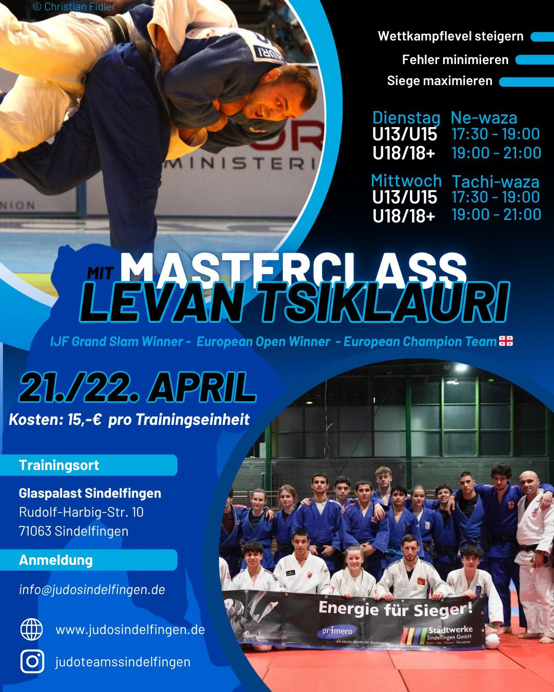 Die Judo-Abteilung des VfL Sindelfingen lädt alle interessierten Judoka zu einem besonderen Judo-Masterclass-Training ein! Am 21. und 22. April habt ihr die Gelegenheit mit dem international erfolgreichen Judoka Levan Tsiklauri zu trainieren.