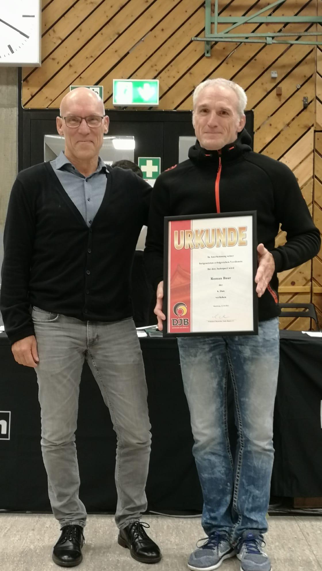 Mit dieser Auszeichnung wird Roman Baur für seine 48-jährige Treue und Hingabe zum Judo geehrt. Er hat den Sport über Jahrzehnte hinweg aktiv mitgestaltet und geprägt. Wir gratulieren herzlich zur Verleihung des 6. Dans und wünschen ihm weiterhin viel Erfolg, Freude und Gesundheit auf seinem weiteren Weg im Judosport.
