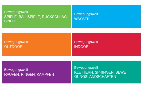 Aufbauend auf den drei thematischen Grundlagen, werden von einzelnen Fachverbänden erste sportartspezifische Grundlagen in unterschiedlichen Bewegungswelten vermittelt.
